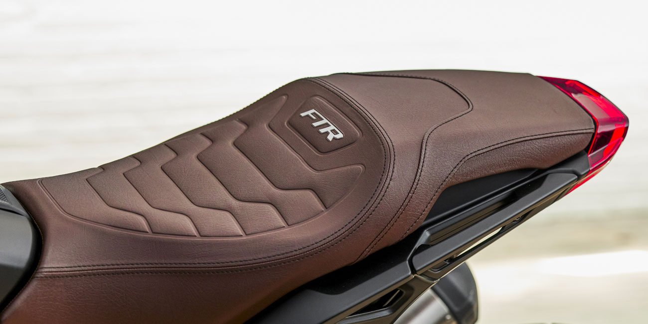 De volledig verstelbare 43 mm upside-down voorvork en enkelvoudige, goed zichtbare achterschokdemper geven de FTR een opvallend uiterlijk. De reusachtige enkelvoudige Brembo-remklauwen met 4 zuigers grijpen aan op 320 mm grote schijven voor ultieme controle en indrukwekkende remkracht. Je hoeft geen stoppies te doen, maar het kan wel!